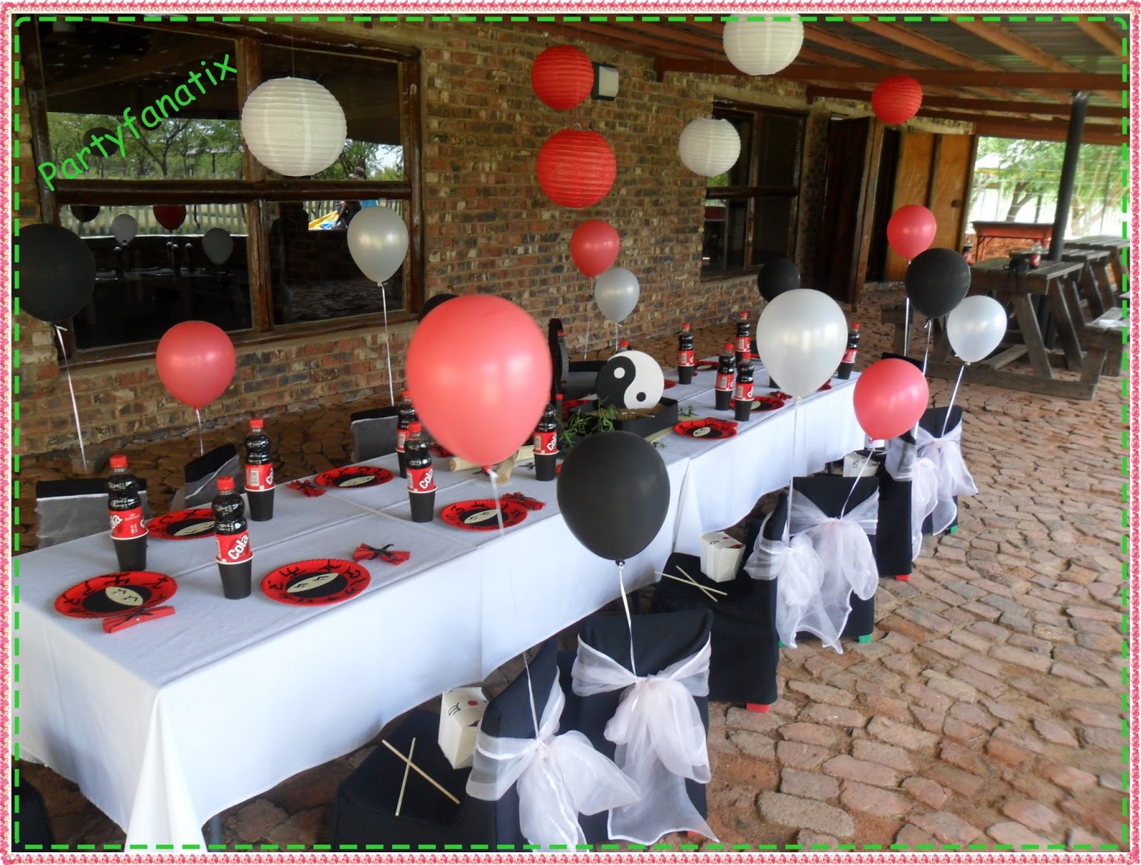 We dug deep into our inner Zen for this one and used our Yin & Yan to do it Ninja Style for this boy who turned 10!!!! There is no theme like that here in South Africa, so I made everything myself! I made little Ninja heads for the plates and wrote in Chinese around it! I made headbands for them instead of party hats and used karate belt straps with a red dot and Chinese writing on both sides of it! The party packs was Chinese Food Containers with Chop Sticks and the serviettes was protected by Ninja stars. Of course we had a Zen-Garden for our Ninja to cool off after the fight! Everything was decorated Chinese style in red, white and black with paper lanterns to provide the perfect soft light.